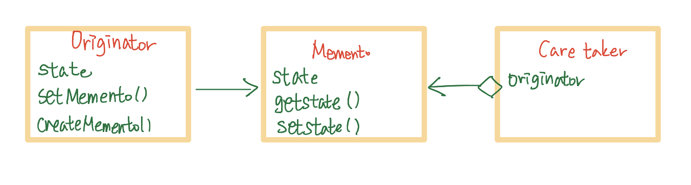 Memento Pattern에서 State를 기록하는 Originator 객체가 State를 기록하고 이를 Memento 객체에 저장합니다. Memento 객체는 Originator 객체를 제외하고는 접근 할 수 없도록 만듭니다. 이러한 Memento 객체들은 Caretaker라는 객체에 저장되며 Caretaker는 제한된 인터페이스를 통해서 Memento 객체를 다루기 때문에 Memento 객체의 내부를 조작할 수 없습니다. 하지만 Originator는 Memento 객체에 자유롭게 접근할 수 있기 때문에 원하는 State로 복원할 수 있게 됩니다.