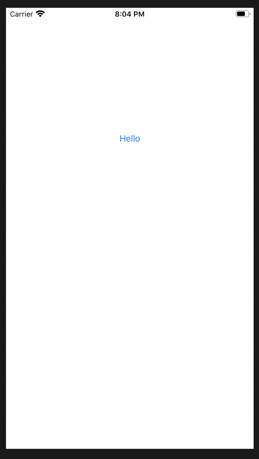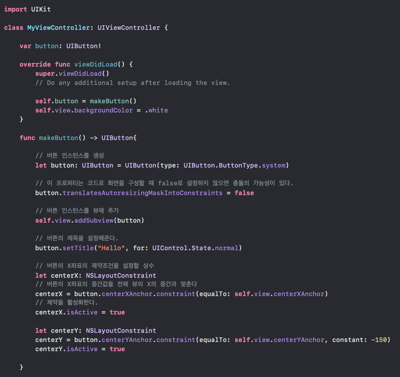 위의 코드와 같이 작성하면 오른쪽 사진과 같이 버튼하나가 추가됩니다. 오토 레이아웃을 설정하는 부분이 어려웠는데 self.view의 경우에는 전체 화면이라고 생각하시면 됩니다. 전체 화면의 중앙이니까 현재 버튼의 x좌표는 화면의 중앙에 있는 것을 볼 수 있습니다. 하지만 y값 같은 경우엔 제가 constant: -150이라는 옵션을 준 것을 볼 수 있는데 이는 전체 화면의 y값의 중앙값에 y축으로 -150만큼 이동한 곳을 버튼의 y값으로 설정하겠다는 말입니다. 그 결과로 버튼이 중앙보다 위쪽에 위치한 것을 볼 수 있습니다.