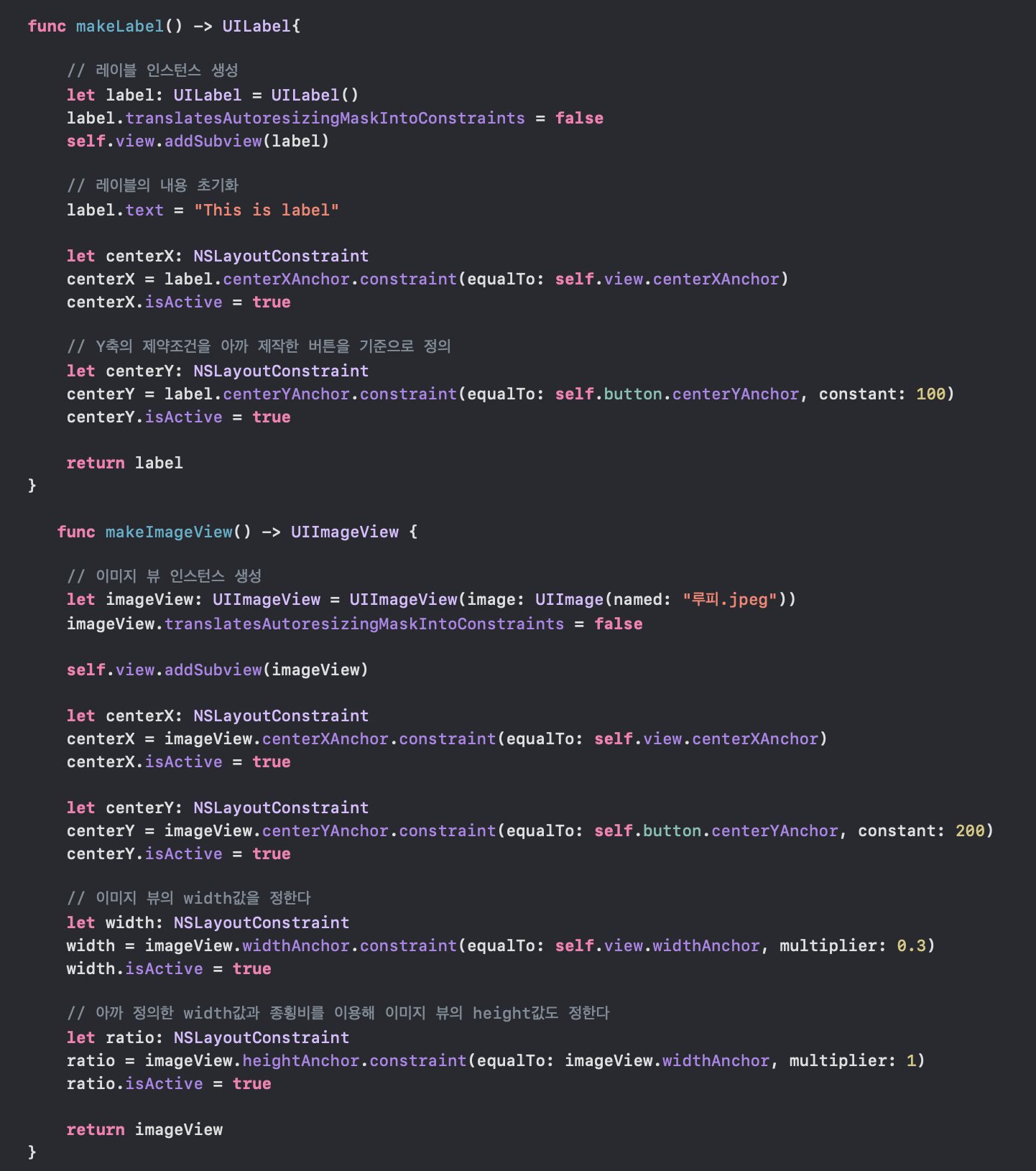 저번 글에 이어 이번 글에서는 스토리보드 없이 만들어진 화면에 버튼과 레이블, 이미지 뷰를 추가해보려고 합니다!