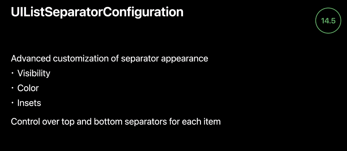 iOS 14.5에서는 리스트의 구분 기호를 완전히 제어할 수 있는 UIListSeparatorConfiguration이 추가되었습니다. 전체 리스트에 대한 구성을 지정하거나 시스템 생성 모양을 오버라이드 해서 구분 기호를 제어할 수 있게 되었다고 합니다.