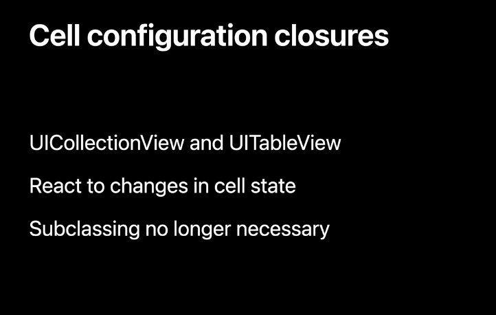 마지막으로 UICollectionView, UITableView의 개선사항입니다. iOS 15부터는 새로운 클로저 기반 업데이트 핸들러를 추가해서 셀을 쉽게 재구성할 수 있다고 합니다.