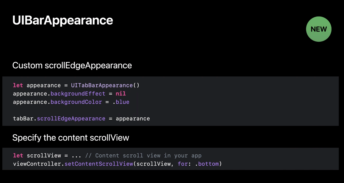 그리고 새로운 scrollEdgeApperance를 수행할 때 UIKit이 관찰하기 위한 적절한 스크롤 뷰를 찾지 못할 수도 있다고 합니다. 그래서 scrollView를 직접 지정해서 이런 문제를 해결하기 위해 UIViewController에 setContentScrollView 메서드를 추가했다고 해요.