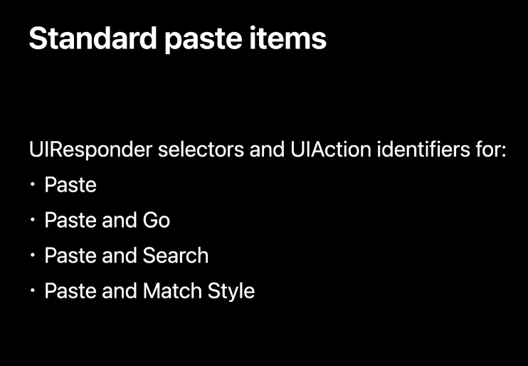 Paste, Paste and Go, Paste and Search, Paste and Match Style가 있고 각각에 대해서 UIMenuController, UICommand를 사용하기 위한 UIResponder selector와 새로운 identifier를 위한 UIAction이 있다고 합니다.