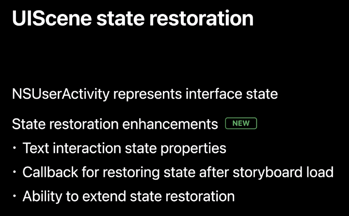 인터페이스 상태는 NSUserActivity로 표시되는데, 앱은 Scene이 background 상태가 될 때 NSUserActivity를 시스템에 제공하고 Scene이 다시 인스턴스화 될 때 인터페이스 상태를 복원하기 위해 사용해야 합니다.