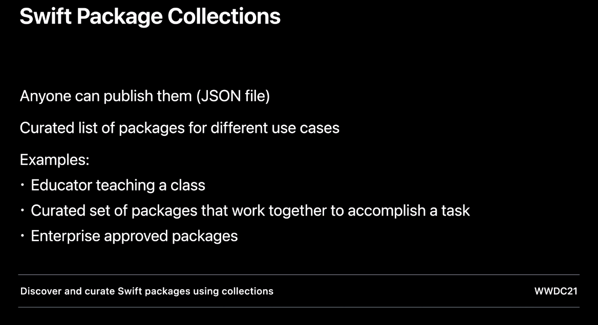 선별된 Swift package 목록을 제공하는 Swift Package Collections를 제공한다고 합니다. 이걸 사용하면 더 이상 인터넷에서 패키지를 검색하거나 URL을 복사 붙여 넣기로 추가할 필요가 없다고 합니다.
