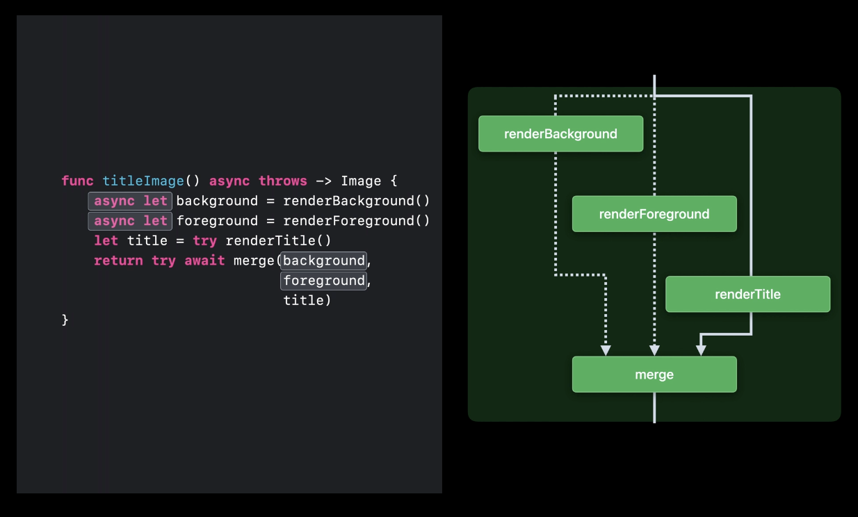 함수 선언부에 async 키워드를 작성하고 지역변수들인 background, foreground를 async let으로 선언하면 해당 값들이 준비될 때까지 merge 작업을 기다립니다. 이를 나타내기 위해서 merge 앞에 await 키워드도 작성해주면 됩니다. 그리고 둘 중 하나의 작업이라도 완료되지 않았다면 함수가 반환되지 않기 때문에 혹시라도 오류가 있으면 반환하기 위한 throws, try 오류처리도 해줍니다.