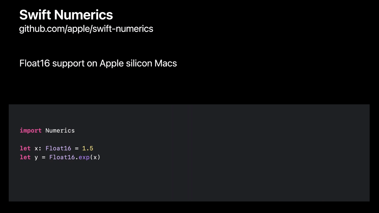 다음은 Swift Numerics입니다. 작년에 iOS, tvOS, watchOS에 Float16이 추가되었다고 하네요. 오.. 없는 거도 몰랐던 1인입니다. 어쨌든 그랬었는데, 올해는 Apple Silicon macs에도 Float 16, Flaot 16 복소수를 사용할 수 있게 되었다고 합니다. 또 로그, 사인, 코사인과 같은 모든 기능에 대한 복소수를 지원한다고 합니다. 이를 Swift로 작성해서 더 잘 사용할 수 있다고 합니다.