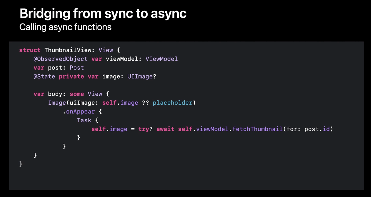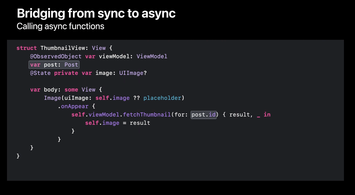 위 코드는 SwiftUI 코드로 뷰가 비동기적으로 id를 가지고 썸네일을 가지고 오는 코드입니다. 이를 async / await로 수정하면 아래와 같아집니다.