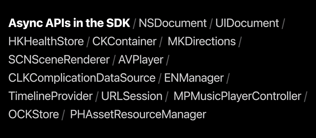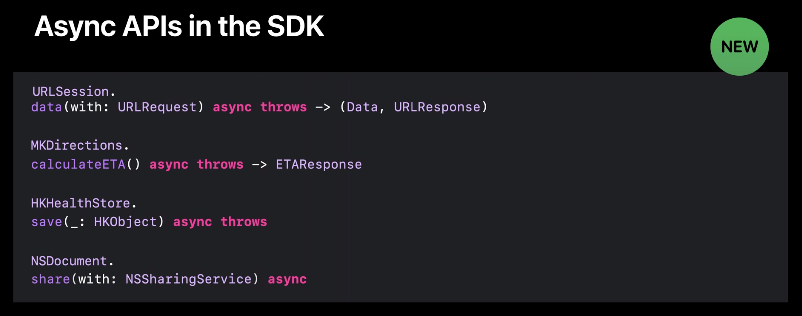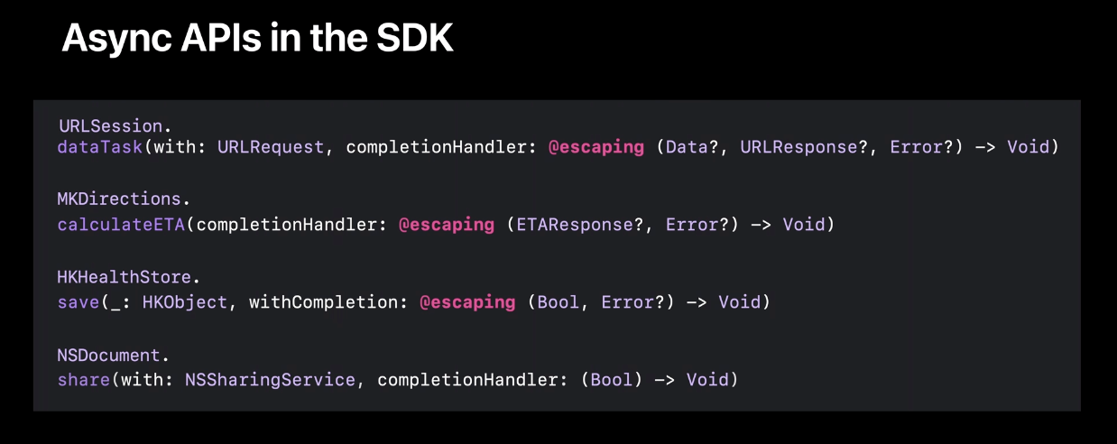 위와 같이 수많은 SDK들이 기존에는 completion handler로 비동기 작업을 제공했는데, 이제는 async / await로 더 자연스럽게 동일 기능을 제공한다고 합니다.