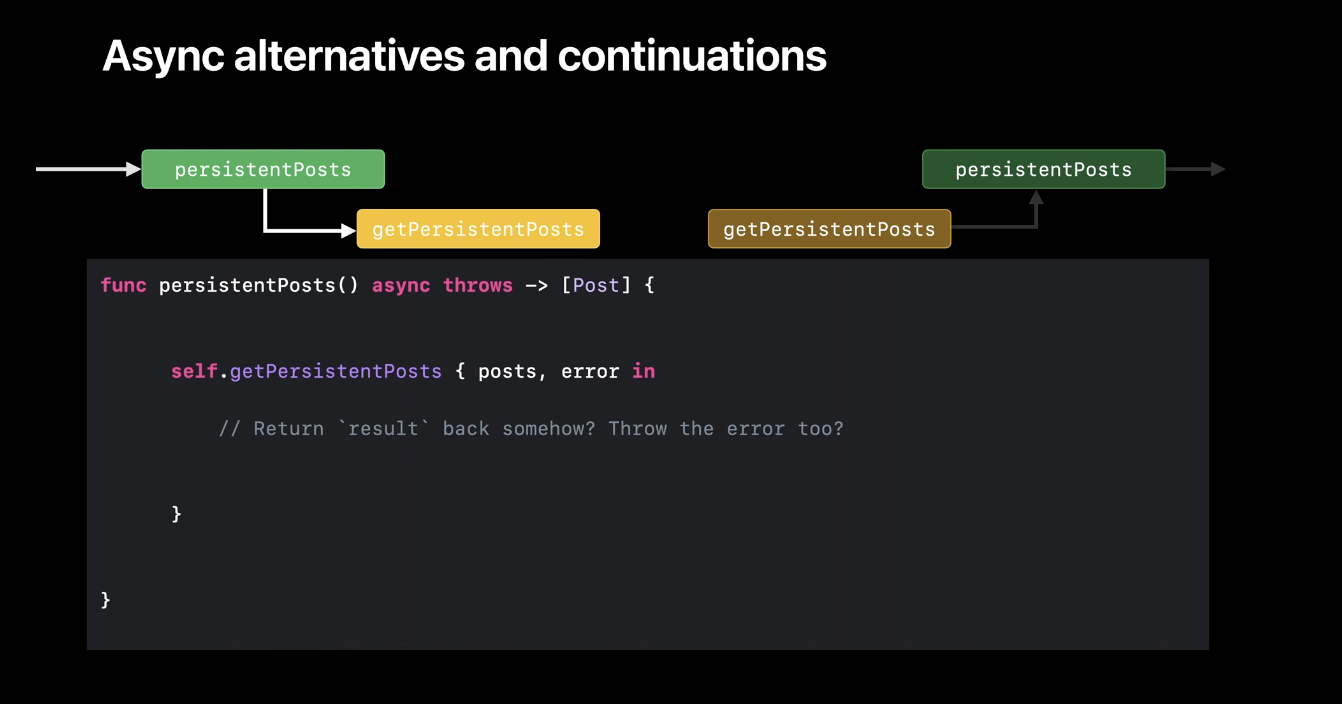 일단 위와 같이 async 함수로 만들고 오류도 처리하기 위해 throws도 추가했습니다. 여기서 아까의 getPersistentPosts 함수를 호출하면 completion handler를 처리해줘야 되는데... async 함수는 일시 정지되면 시스템에 스레드를 반환하기 때문에 다음 작업을 수행할 적절한 시점을 찾아야 합니다.