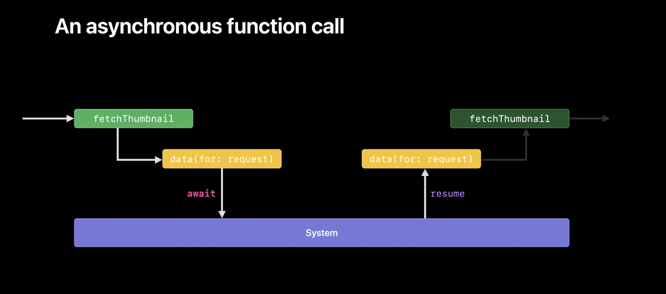 비동기 함수의 경우 일반적인 함수와 다릅니다. 일반 함수는 함수가 종료되는 경우에만 스레드를 반환할 수 있었지만 비동기 함수의 경우 suspending(일시 정지)를 통해 스레드를 반환할 수 있습니다. 비동기 함수도 호출될 때는 스레드에 대한 제어권을 받게 됩니다. 그러다 await 키워드를 만나면 스레드를 반환합니다. 이때 호출자에게 스레드를 반환하는 것이 아닌 시스템에 반환합니다. 따라서 시스템은 해당 스레드를 활용하여 다른 작업들을 수행하다가 어느 시점이 되면 시스템은 다시 비동기 함수에 스레드 제어권을 줍니다. 그러다 결국 비동기 함수가 실행을 마치고 에러나 결과를 반환하고, 스레드 권한을 호출자에게 다시 넘기게 됩니다.