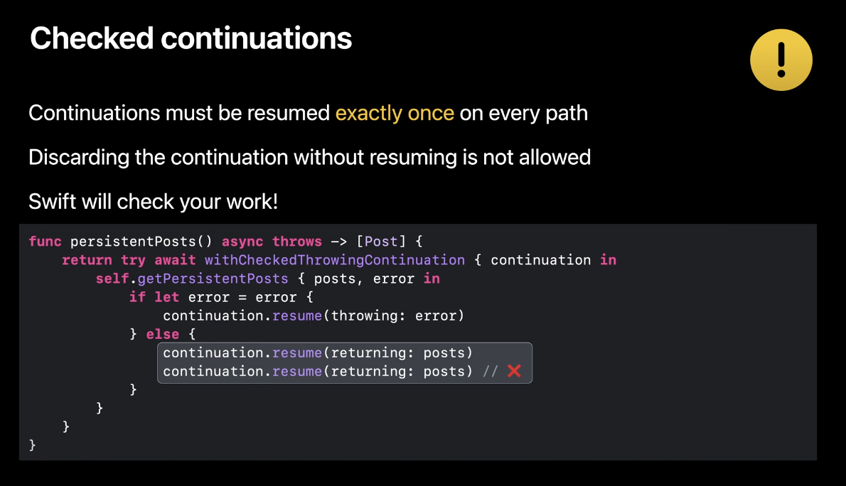Continuation value는 completion handler의 처리하기 위한 값을 제공합니다. 이렇게 하면 completion handler와 async 함수를 함께 사용할 수 있습니다. 이렇게 async 함수의 실행을 수동으로 제어하기 위해 continuation을 사용할 때 주의할 점들이 있습니다.