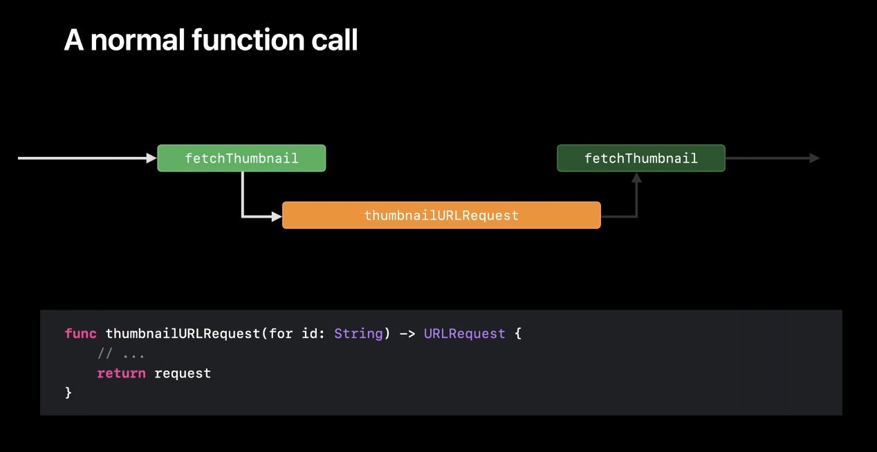 일반적인 함수를 호출하면 스레드도 함께 해당 함수에 넘겨줍니다. 그리고 호출된 함수는 스레드를 자신의 작업이 끝날 때까지 가지고 있죠. 함수가 종료되기 위해서는 정상적으로 값을 반환하거나 에러를 발생해야 하고, 이렇게 종료되면 스레드를 다시 호출자에게 넘겨줍니다. 즉 함수가 스레드를 반환할 수 있는 유일한 경우는 함수가 종료되는 경우입니다.