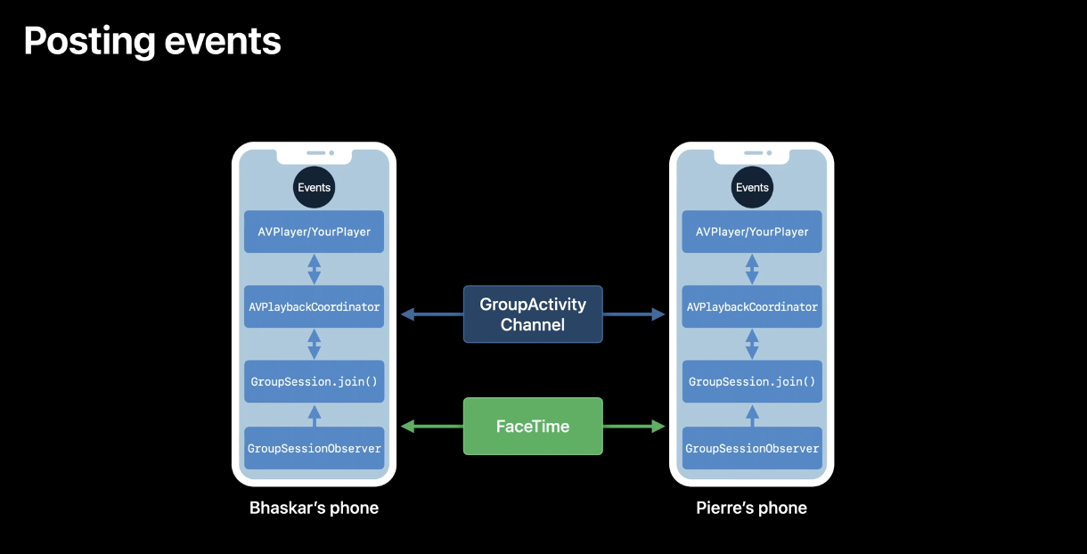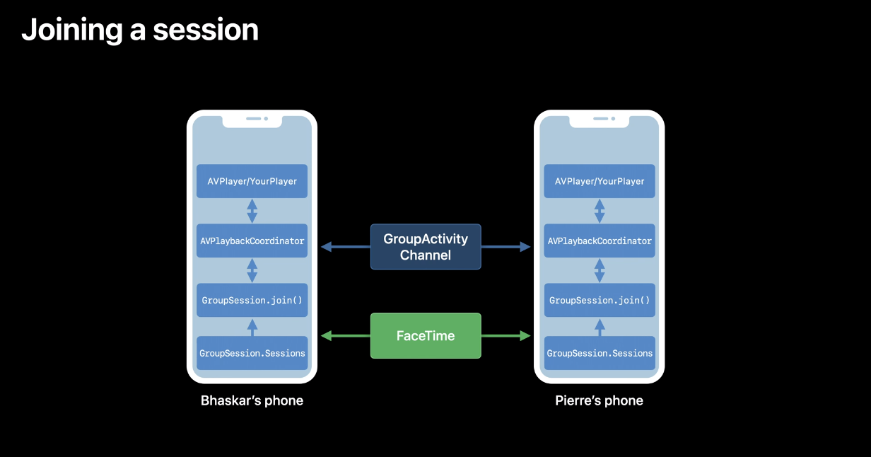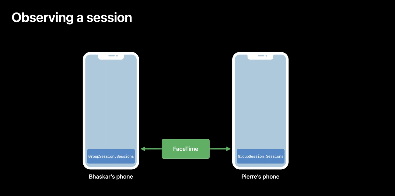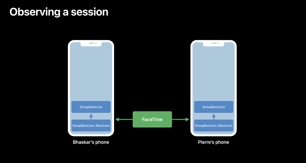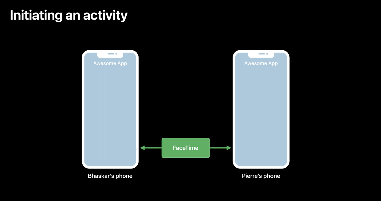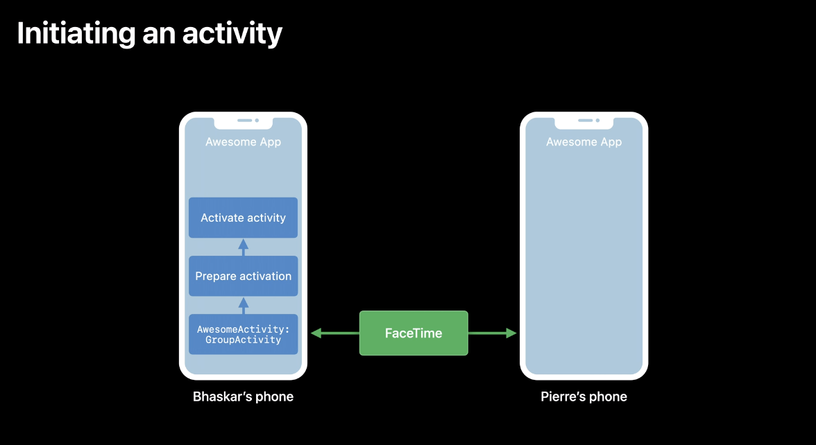 위와 같이 두 개의 아이폰이 있고 왼쪽은 Bhaskar, 오른쪽은 Pierre라는 사람의 폰입니다. 둘은 FaceTime 통화를 하고 있고 "Awesome App"이라는 Group Activity를 사용하여 공유 기능을 제공하는 앱을 사용하고 있다고 합니다. 왼쪽 폰에서 activity를 시작한다고 가정해볼게요.