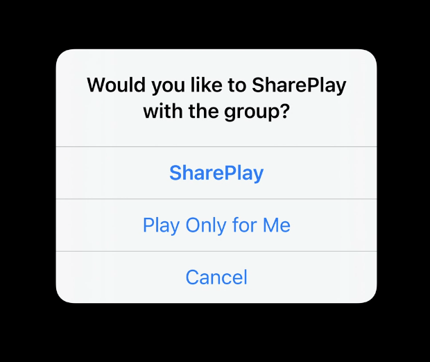 Share Play를 위한 새로운 API를 사용하면 그룹 대화가 활성화된 상태에서의 재생 버튼은 위와 같이 미디어를 공유할 수 있는 기능이 추가됩니다.