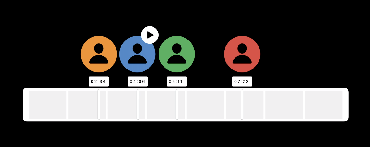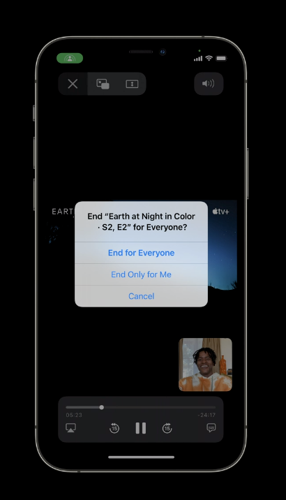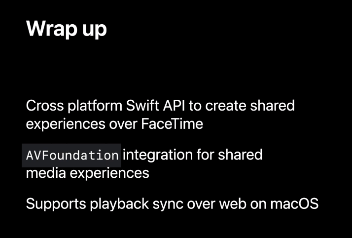 Share Play를 사용하면 재생 시간을 플랫폼 수준에서 동기화된 상태로 유지하기 때문에 이를 걱정할 필요가 없다고 합니다. 이를 위해 iPhone과 같은 기기의 AVFoundation 스택에 통합된 새로운 playback-sync 프로토콜을 만들었다고 합니다. 이를 통해 그룹의 누군가가 재생을 누르면 그룹의 모든 사람의 영상이 재생되게 됩니다. 누군가 보여주고 싶은 장면으로 이동하면 모두 해당 화면으로 이동하게 되겠죠.