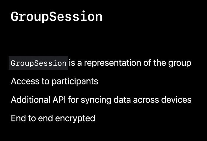GroupSession은 공유 기능에 참여하는 그룹을 나타냅니다. 그룹의 참가자와 같은 값들에 대한 접근을 제공하며 프레임워크에는 GroupSession과 함께 사용해서 장치 간 데이터를 주고받을 수 있는 API도 있습니다.