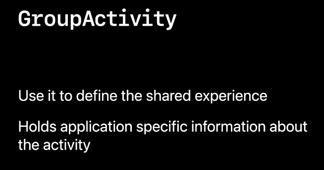 GroupActivity는 앱이 공유 경험을 정의할 때 사용합니다. 이는 앱이 공유 기능을 제공하기 위해 필요한 정보들을 가지고 있습니다. 예를 들어 공유 오디오, 비디오 재생을 사용하는 경우 재생 중인 콘텐츠의 URL을 가지고 있습니다.