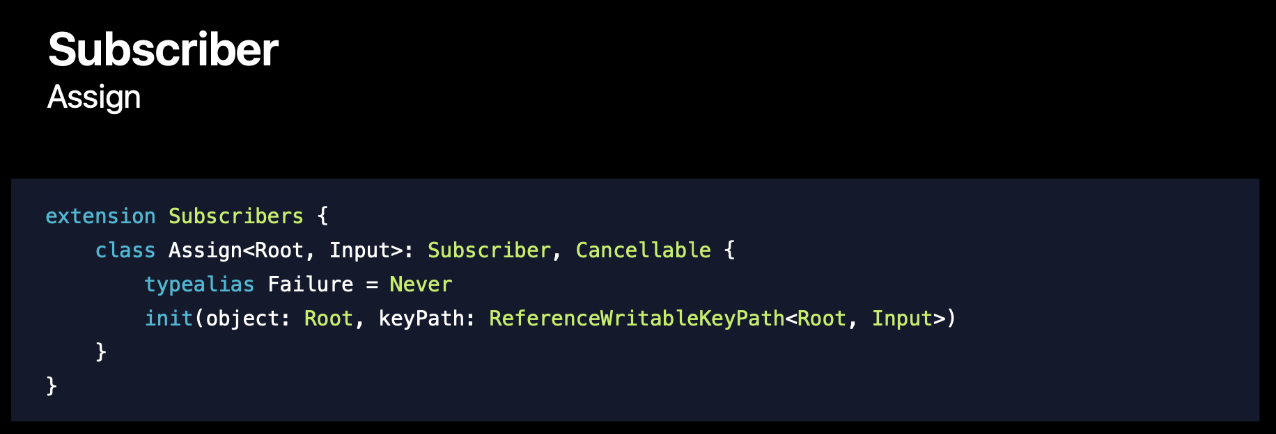 위와 같은 것을 Assign(할당)이라고 하며 클래스입니다. 얘가 하는 일은 Upstream에서 input을 받으면 해당 객체의 프로퍼티에 기록하는 것이라고 하네요. Swift에서는 프로퍼티 값을 작성할 때 오류를 처리할 방법이 없기 때문에 Failure를 Never로 설정해준 것도 볼 수 있습니다.
