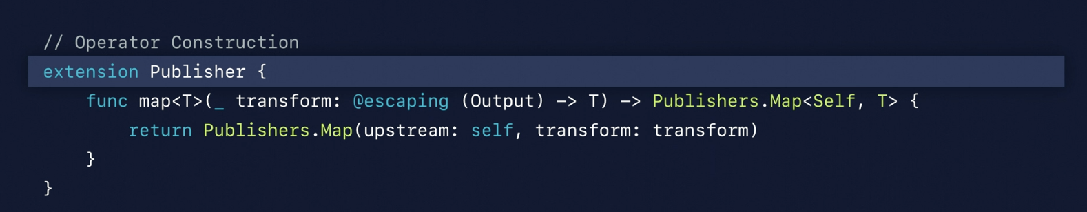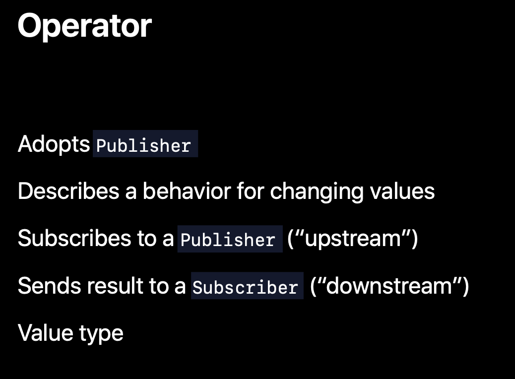 Operator는 Publisher 프로토콜을 채택하므로 Publisher와 동일하게 뭔가를 생성합니다. 선언적이므로 값 타입이며 Operator는 값을 변경하거나, 추가, 제거와 같은 다양한 동작을 처리하는 일을 합니다. 그리고 먼저 실행되는 Upstream Publisher를 subscribe 하는 일, 이후에 실행될 Downstream Subscriber에게 결과를 보내는 일을 합니다.