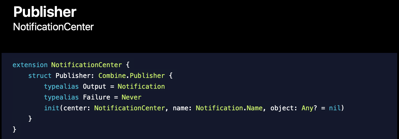 간단한 예를 보면 위와 같습니다. 위 코드는 NotificationCenter를 위한 새로운 Publisher입니다. Output은 Notification이고 Failure는 Never 타입이네요. Center, name, object로 생성되는 것도 알 수 있습니다. 아까도 말했듯 Combine은 기존의 API들을 대체하는 것이 아닌 것을 볼 수 있습니다.
