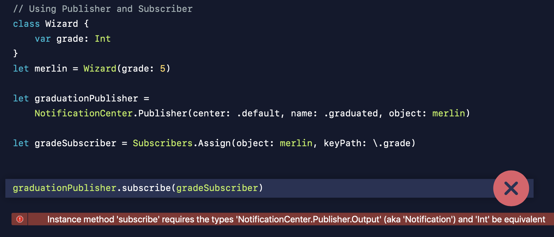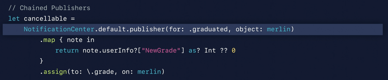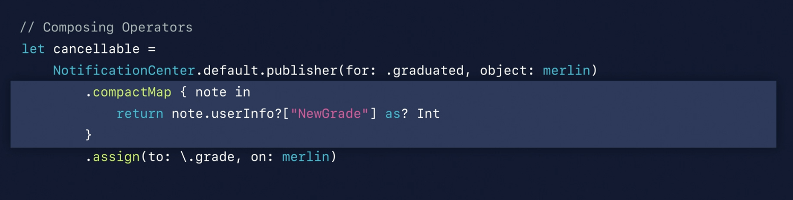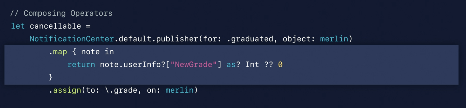 아까 코드에서 converter라는 녀석이 추가되었습니다. Converter의 클로저는 알림을 수신하고 NewGrade라는 userInfo를 가지고 정수이면 클로저에서 반환합니다. 이렇게 하면 클로저의 결과가 정수가 되어 Subscriber에 연결할 수 있게 됩니다. 아까 발생했던 컴파일 오류도 해결되는 것을 볼 수 있어요.