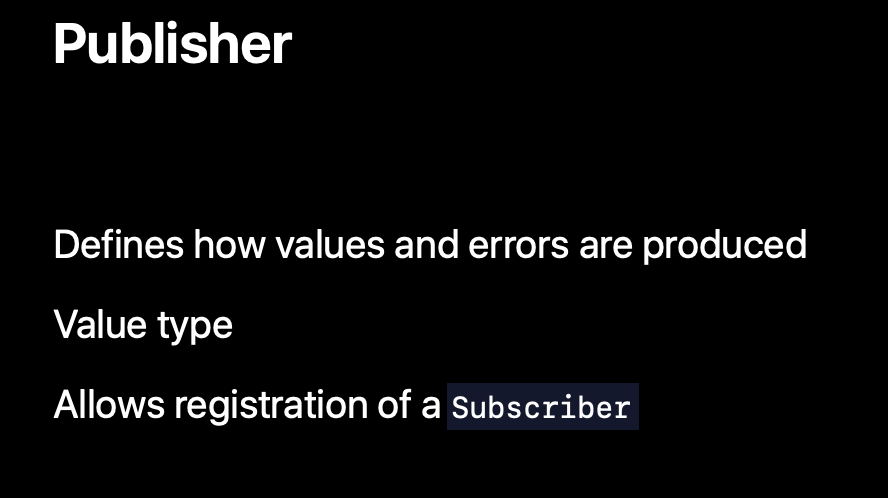 Publisher는 Combine API의 선언 부분이라고 합니다. 즉 값과 오류가 생성되는 방식을 알려줍니다. 이름과 다르게 Publisher가 반드시 뭔가를 생산하는 것은 아니라고 하네요. 구조체를 사용하기 때문에 Value 타입이며 Subscriber 등록도 허용한다고 합니다.