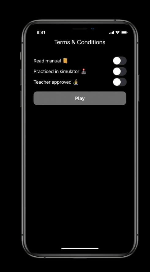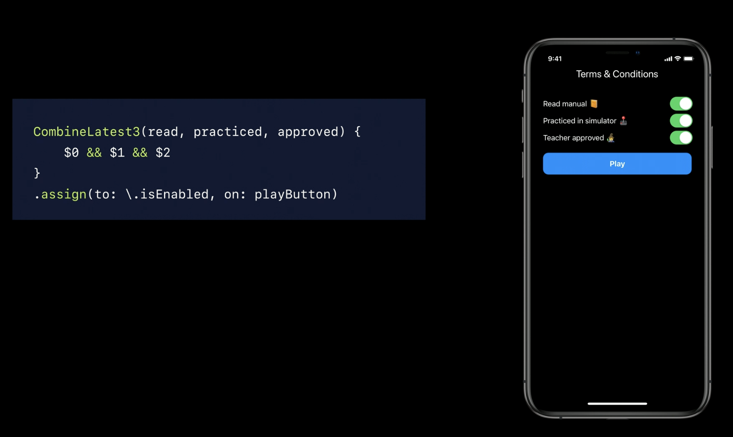 이를 코드에 활용하면 위와 같습니다. 3개의 upstream을 사용하는 CombineLatest를 사용해서 3개의 스위치가 모두 활성화되었을 때만 true를 downstream에 전달해주고 다른 경우에는 모두 false를 전달하게 됩니다. 이렇게 하면 Play 버튼의 활성화 여부를 쉽게 관리할 수 있게 됩니다.