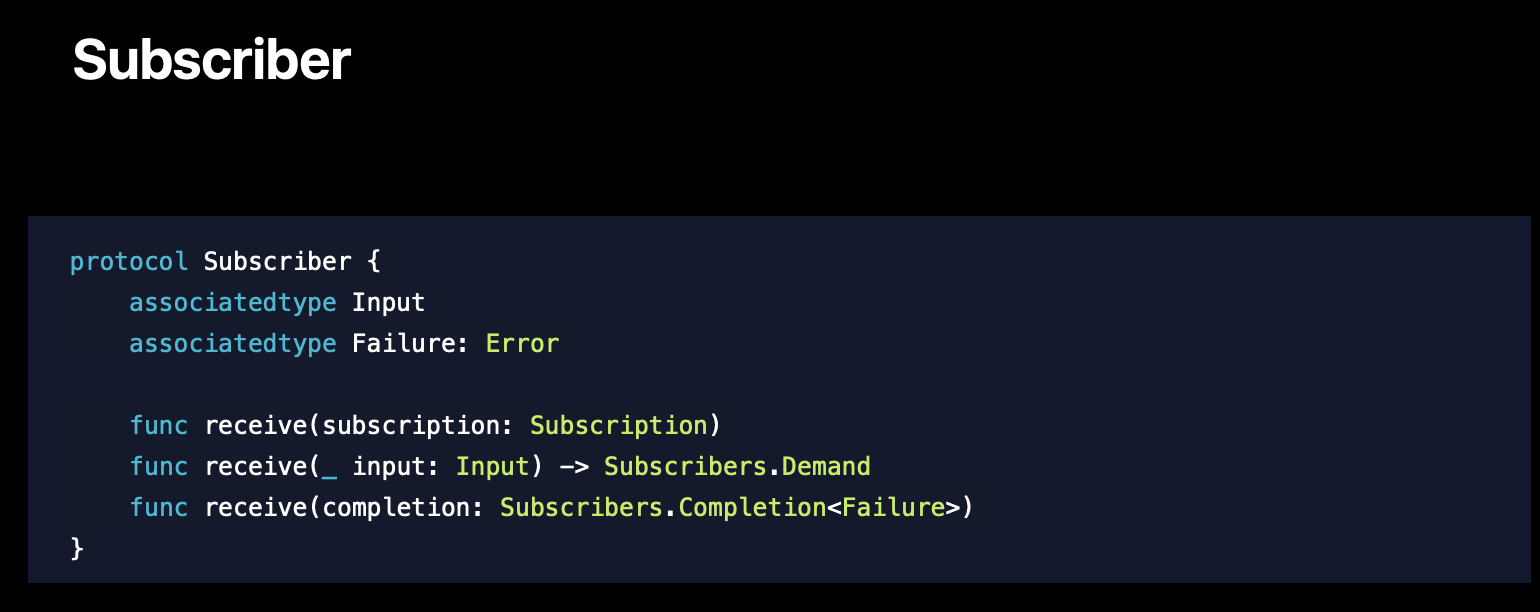다음은 Subscriber입니다. Subscriber는 Publisher와 반대되는 개념으로 Publisher에게 값을 받습니다. Subscriber는 값을 받게 되면 뭔가를 처리하고 상태를 변경하기 때문에 Swift의 class와 동일한 reference type을 사용합니다.