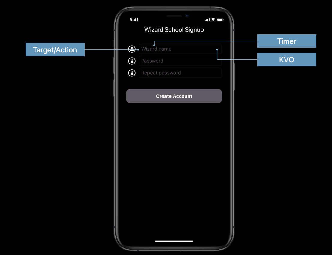 만약 사용자 이름을 입력하게 된다면 Target / Action을 통해 사용자 입력에 대한 알림을 받습니다. 그리고 입력한 이름이 유효한 이름인지 서버를 통해 확인하기 위해 네트워크 통신을 하는데요, 이때 Timer를 사용해서 사용자의 네트워크 요청이 서버에 과부하를 주지 않기 위해 사용자 입력이 멈출 때까지 기다립니다. 그리고 KVO 등을 통해 비동기 작업에 대한 진행률 업데이트도 수신할 수 있습니다.