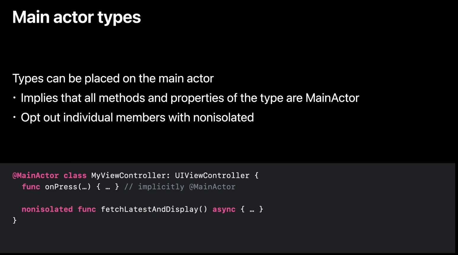 타입은 MainActor에도 위치시킬 수 있으므로 모든 멤버와 하위 클래스가 MainActor에 존재하게 됩니다. 이는 대부분 모든 것이 Main 스레드에서 실행되어야 하는 UI 관련 코드를 작성할 때 유용합니다.