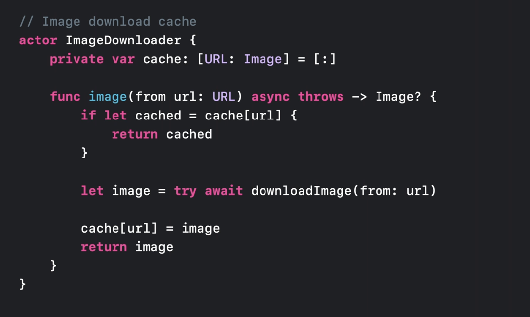 로직은 간단합니다. 캐시를 확인하고 캐시에 이미지가 없다면 다운로드한 뒤 캐시에 저장하고 나서 반환합니다. 이는 Actor에서 실행되는 코드이므로 data races로부터 안전합니다. 따라서 원하는 수의 이미지를 동시에 다운로드할 수 있습니다.