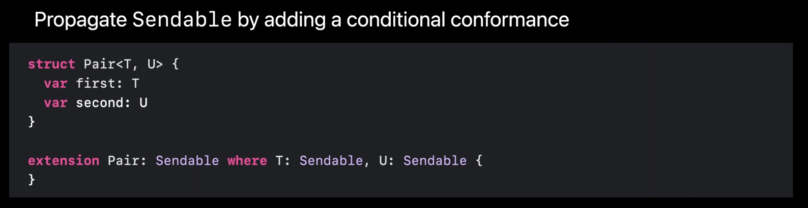 제네릭 타입의 경우 Sendable 여부는 제네릭 인수에 따라 달라질 수 있습니다. 적절할 때 Sendable을 전파할 수 있도록 조건을 달 수 있습니다. 위와 같이 Pair 타입은 인수가 모두 Sendable인 경우에만 Sendable이 됩니다.