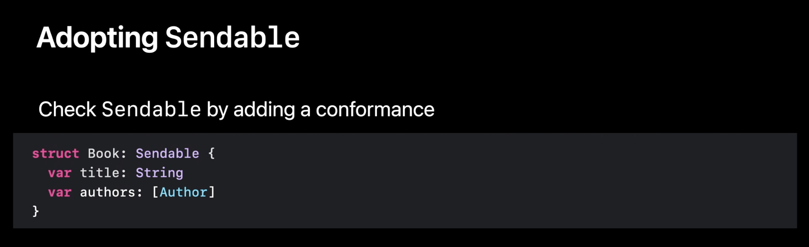 타입이 Sendable인건 어떻게 알 수 있을까요? Sendable을 프로토콜이고 이를 따르면 Sendable 타입이라고 할 수 있습니다. 그런 뒤 Swift는 타입이 Sendable인지 확인합니다. 위 코드에서 Book 구조체는 모든 프로퍼티가 Sendable 타입이라면 Sendable입니다.