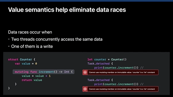 이러한 Data races는 shared mutable state(변경 가능한 공유 상태)로 인해 발생합니다. 즉 데이터가 변경되지 않거나 다른 스레드와 공유되지 않는 경우엔 발생하지 않습니다. 따라서 Data races를 피하는 한 가지 방법은 value semantic을 사용해서 shared mutable state를 제거하는 것입니다. 예를 들어 Swift에서 let을 사용해서 변수를 만들면 변경이 불가능해져서 data races로부터 안전합니다.