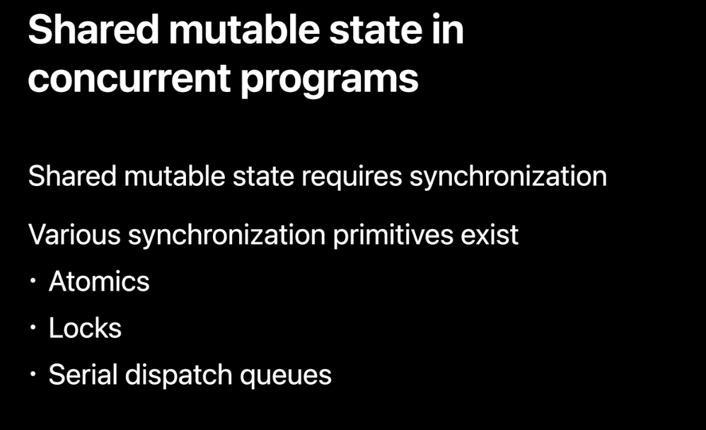 원하는 결과를 얻기 위해 동시성 프로그램에서 shared mutable state가 있는 경우 이로 인해 data races를 발생하지 않도록 동기화가 필요합니다. Atomics(원자성), Locks, Serial dispatch queue와 같은 것들이 이런 문제를 해결할 수 있습니다. 이런 것을 사용하면 장점도 있긴 하지만 모두 주의해서 사용하지 않으면 data races는 해결되지 않을 거예요.