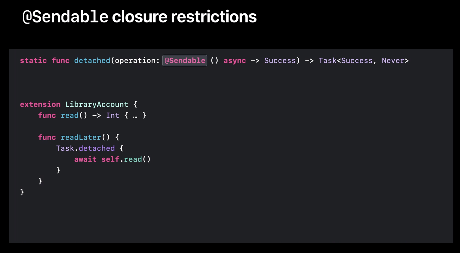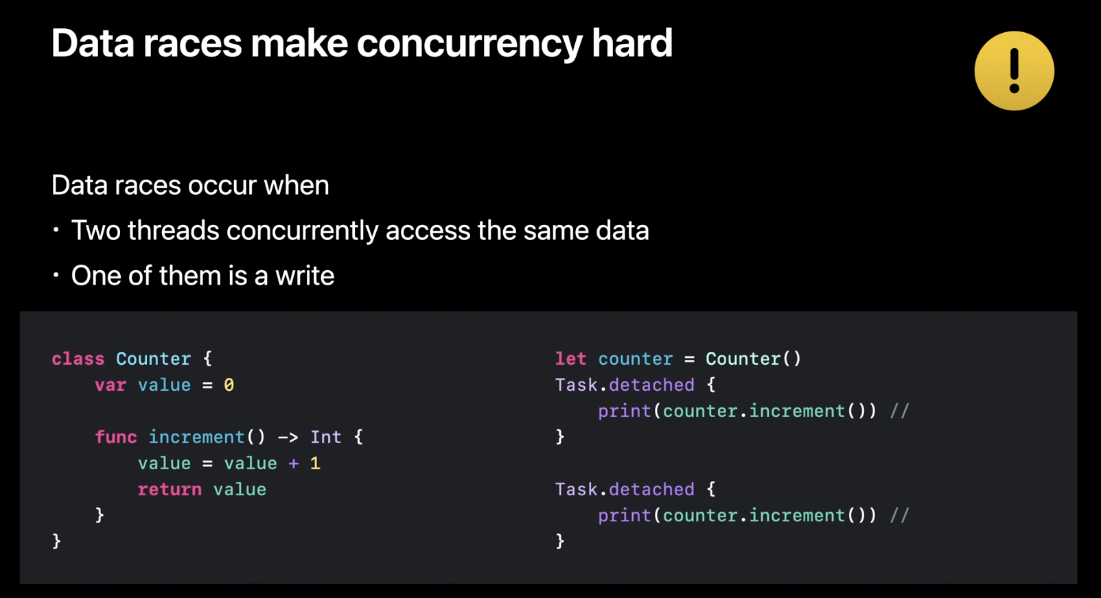 detached task를 생성하는 작업은 함수 타입에 @Sendable 키워드가 붙은 Sendable 함수를 사용했습니다. 이번 영상 시작 부분에서 값 타입 Counter를 만들던 예를 기억하시나요? 해당 예에서는 두 개의 다른 클로저에서 동일한 값을 동시에 수정하려고 했었죠. 이는 Sendable 지역 변수에 대한 data race를 발생시키는 것입니다.