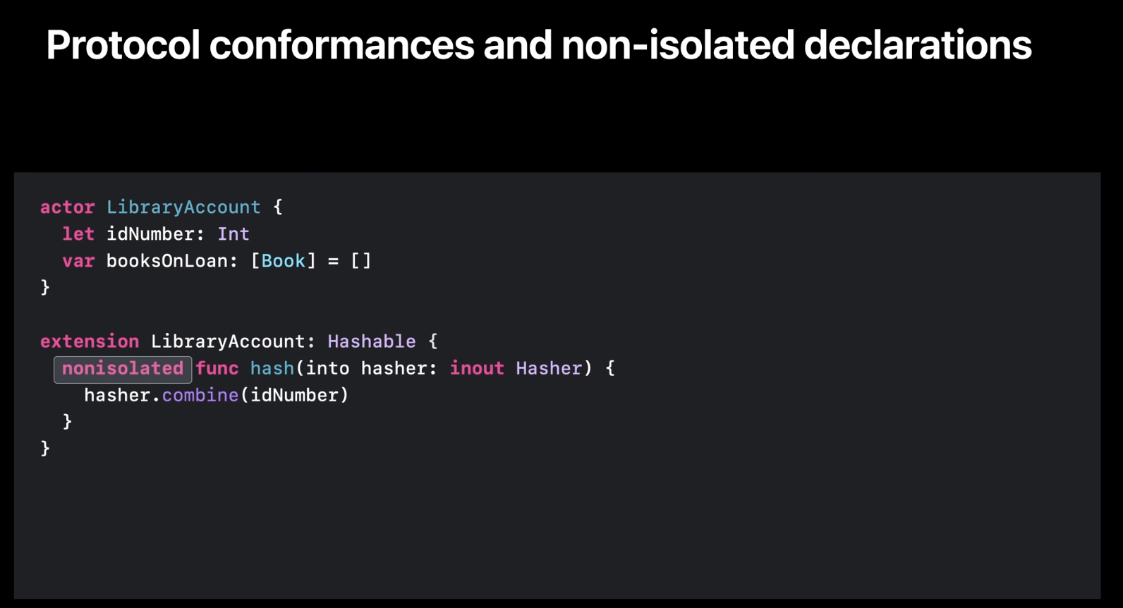 이를 수정하기 위해서 메서드를 nonisolated로 만들면 됩니다. nonisolated는 이 메서드가 Actor 외부에 있는 것으로 처리된다는 것을 의미합니다. nonisolated 메서드는 Actor 외부에 있는 것처럼 처리되므로 Actor의 mutable state를 참조할 수 없습니다. 물론 위 코드에서 idNumber는 변경할 수 없으므로 문제는 없습니다. 하지만 bookOnLoan 프로퍼티와 같은 array로 hash를 시도하면 외부에서 mutable state에 접근하면 data races를 허용하므로 오류가 발생합니다.