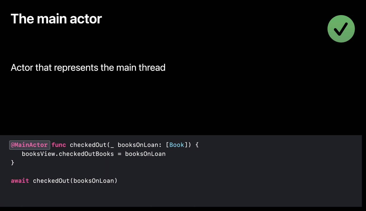 Swift 동시성을 사용하면 MainActor를 표시해서 main actor에서 실행되어야 한다고 선언할 수 있습니다. 위 코드에서 checkedOut() 메서드는 항상 MainActor에서 실행됩니다.