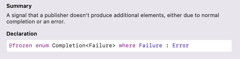 다음으로 알아볼 것은 Completion입니다. 얘도 Demand와 동일하게 Subscriber는 아니고 Subscriber를 사용할 때 필요한 녀석인데요, 아까 DemandTestSubscriber를 직접 구현할 때 receive(completion:)에서 썼었습니다 ㅎㅎ