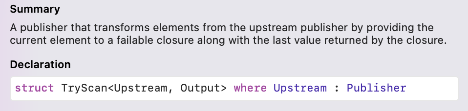 TryScan Publisher를 활용해서 만든 Operator는 tryScan(_:_:)입니다.