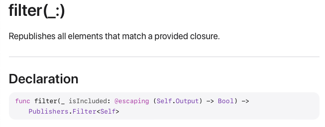 정의를 보면 제공된 클로저를 사용해서 모든 element를 조건에 맞는 것만 내보내는 publisher라고 되어있습니다.