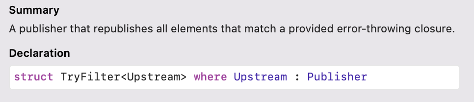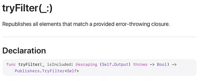 TryFilter Publisher로 만들어진 Operator는 tryFilter(_:)입니다.