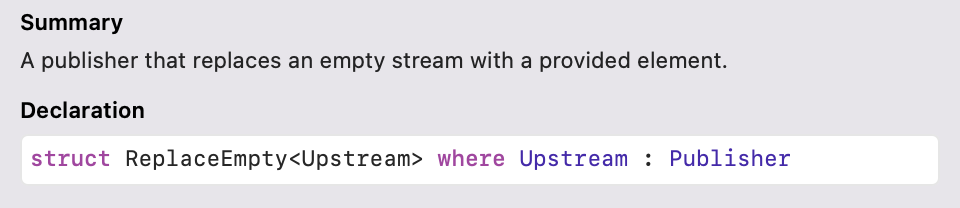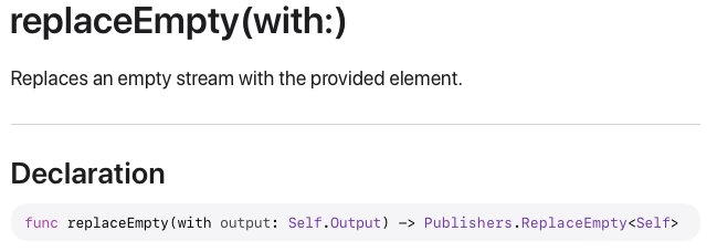 ReplaceEmpty Publisher를 활용해서 만들어진 replaceEmpty(with:)의 정의를 보면 간단하게 Upstream에서 빈 stream을 받으면 매개변수로 받은 값으로 대체해서 Downstream으로 보내는 역할을 한다고 합니다.