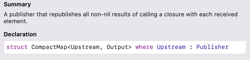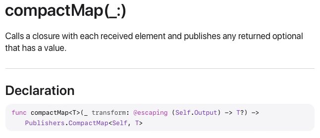 정의를 보면.. upstream에서 받은 element를 클로저에 전달해서 처리된 값이 nil이 아닌 값들만 downstream으로 내려보내는 publisher인 듯합니다.