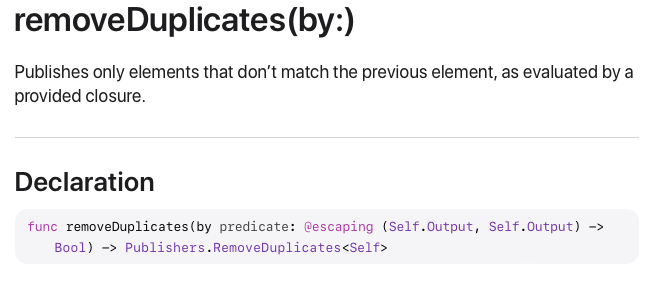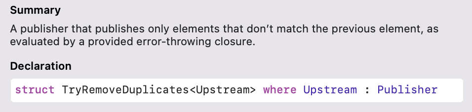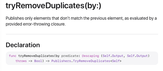 TryRemoveDuplicates Publisher를 활용해서 만들어진 tryRemoveDuplicates(by:)의 정의를 봐도 아까 알아본 removeDuplicates(by:)와 동일하지만 에러만 던질 수 있다는 차이가 있네요.