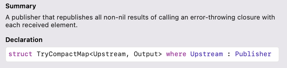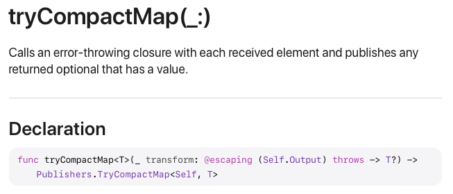 TryCompactMap Publisher를 활용해서 만들어진 Operator는 tryCompactMap(_:)입니다.