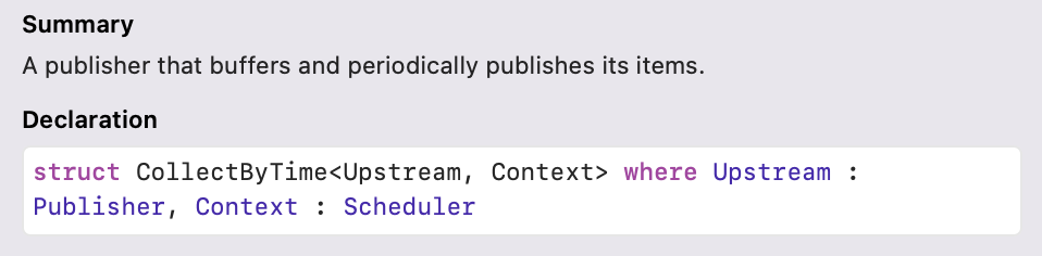 다음으로 알아볼 것은 CollectByTime입니다. CollectByTime의 정의를 보면 Upstream에서 받은 값을 가지고 있다가 주기적으로 Downstream으로 내려보내는 Publisher라고 하네요. 그리고 정의에 Scheduler가 있는 걸 보면 스케줄러에 의해 주기가 정 해지는 거 같습니다.