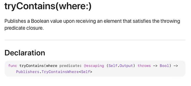 그리고 TryContainsWhere를 활용해서 만든 tryContains(where:) Operator도 아까 알아본 contains(where:)에서 에러만 던진다는 차이점만 존재합니다.