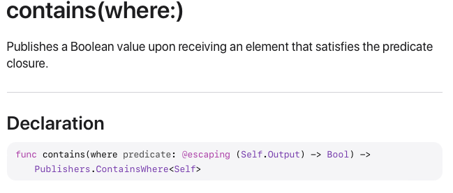 ContainsWhere Publisher를 활용해서 만든 Operator는 contains(where:)입니다.